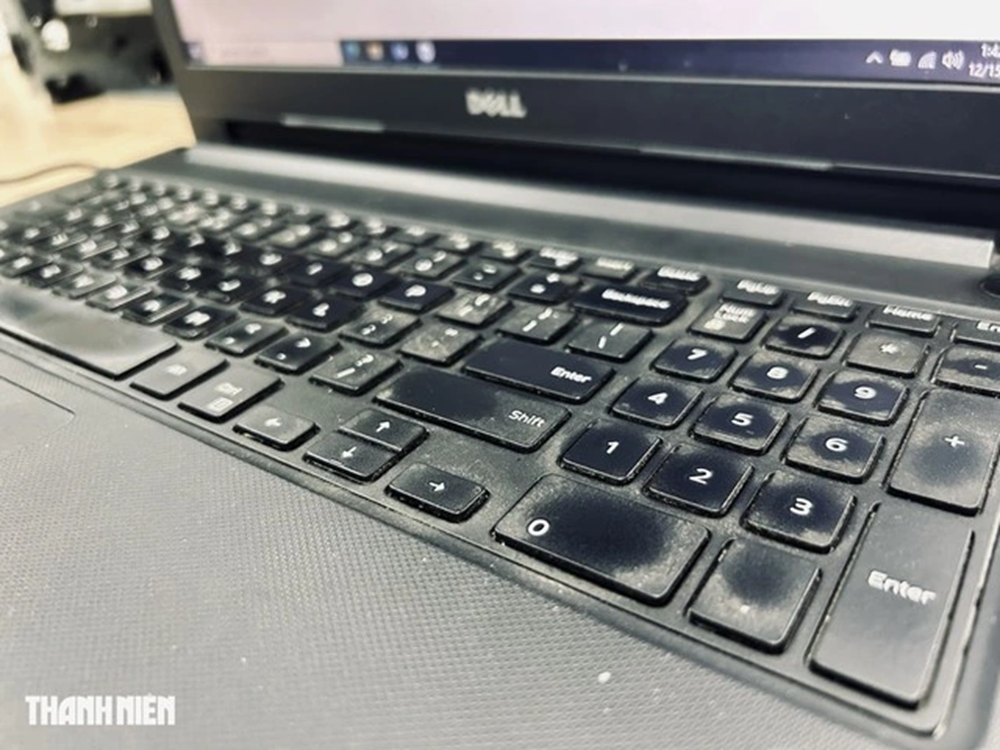 Loại bỏ bụi thô: Lật ngược laptop và lắc nhẹ để các vụn lớn rơi ra ngoài. Dùng bình xịt khí nén thổi vào khe giữa các phím (hãy nhớ xịt thử ra ngoài trước để thông khí và cầm bình thẳng đứng).